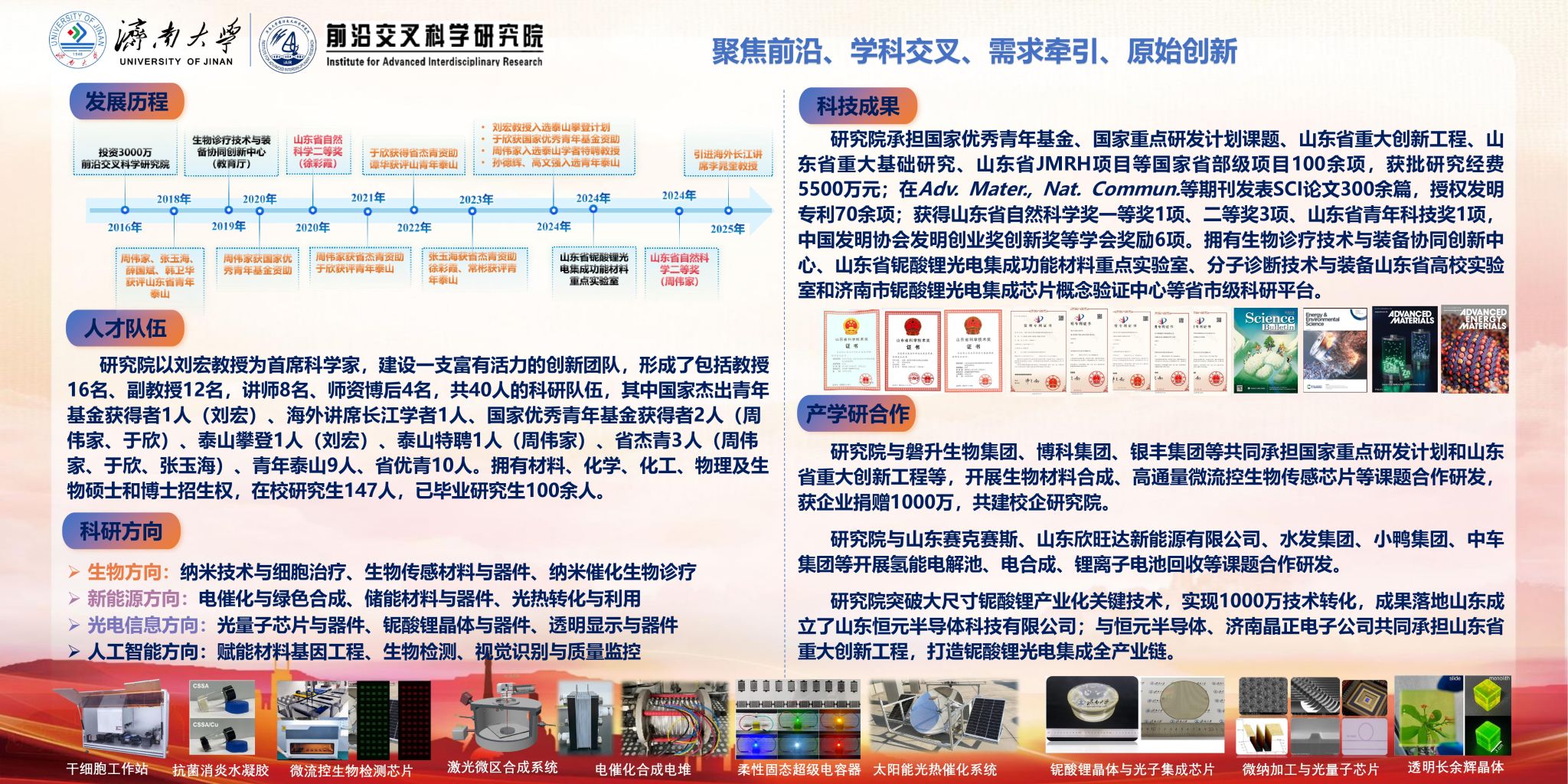 研究院硬件设施完备,配备场发射扫描显微镜、共聚焦扫描显微镜、拉曼光谱仪等一系列先进的测试表征、材料制备及微加工设备,总价值超 4500 万元。同时,依托生物诊疗技术与装备协同创新中心、山东省铌酸锂光电集成功能材料重点实验室、分子诊断技术与装备山东省高校实验室、济南市铌酸锂光电集成芯片概念验证中心等省市级科研平台,为科研攻关与成果转化提供坚实支撑。