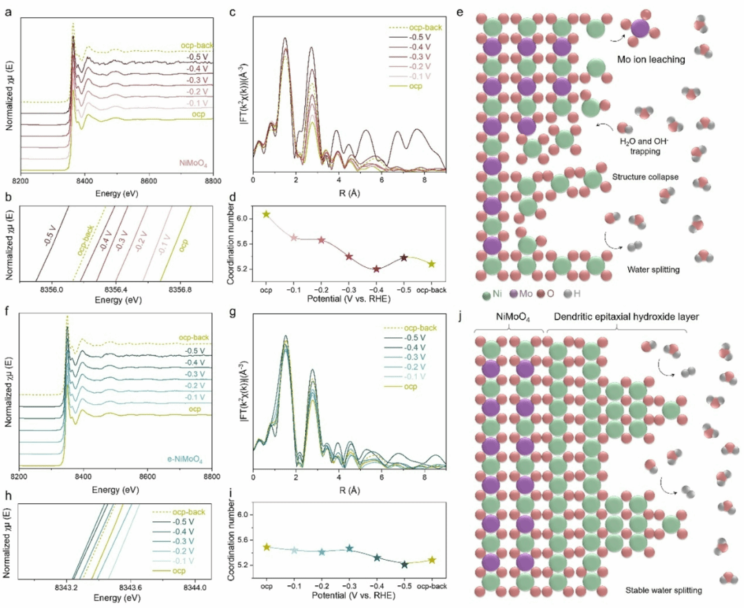 Figure 3重点揭示两者在不同工作电位下的结构动态演化差异:通过原位Ni K-edge XANES 光谱观察到,NiMoO4随施加电位变化会出现镍氧化态明显降低,而e-NiMoO4中镍的氧化态仅在小范围内波动;对应 EXAFS 光谱及拟合结果显示,NiMoO4的Ni配位环境随电位升高发生显著变化,伴随钼溶出引发的不可逆整体结构改变,而e-NiMoO4的Ni-O键长、配位数目仅出现可忽略的波动;结合稳定性机制示意图可知,e-NiMoO4表面的外延层能缓解钼溶出导致的结构坍塌,维持材料整体结构完整性,而NiMoO4因缺乏该保护作用出现明显结构劣化,这些原位表征结果进一步印证了外延层对提升催化剂析氢过程中结构稳定性的关键作用。