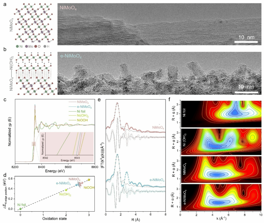 Figure 1 为表面构建外延层的镍钼酸盐(e-NiMoO4)与未修饰镍钼酸盐(NiMoO4)的结构表征图,通过多种表征手段揭示了外延层的生长特征及材料结构差异:TEM 图像显示e-NiMoO4表面形成纳米树枝状外延层,其晶格结构对应氢氧化镍的特定晶面,证实外延氢氧化物层在镍钼酸盐表面成功锚定;Ni K-edge XANES 光谱及氧化态分析表明,e-NiMoO4中镍的氧化态低于未修饰的镍钼酸盐;Ni K-edge EXAFS 光谱的傅里叶变换结果进一步印证了外延氢氧化物层的存在,且e-NiMoO4中镍与氧的配位环境发生变化;EXAFS 信号的小波变换等高线图确认e-NiMoO4中镍氧化态降低与镍氢氧化物有关,同时钼的配位环境虽有轻微变化但整体框架保持完整,体现出外延层对材料结构稳定性的提升作用。