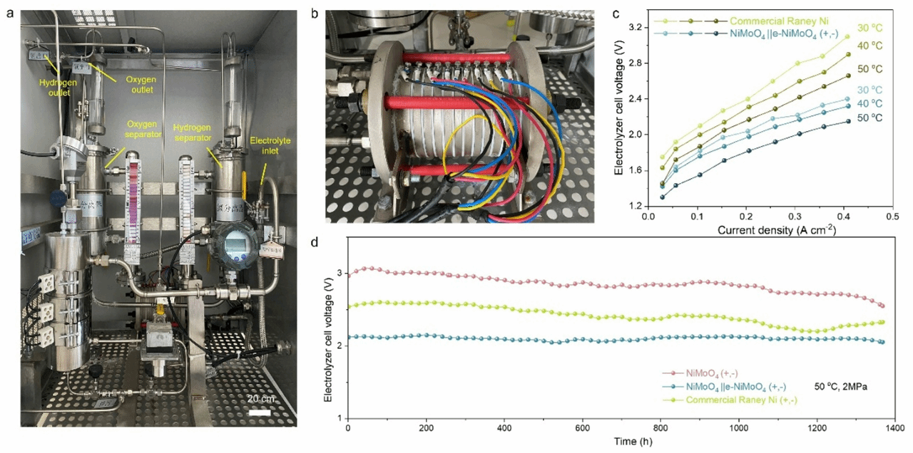 我们开发了一种高活性且高稳定性的析氢反应催化剂,该催化剂在工业碱性电解槽中保持稳定运行至少1400小时。在NiMoO4表面构建的稳定外延氢氧化物层,能够协同增强活性羟基的吸附作用,进而降低析氢反应能垒。此外,枝晶状外延催化层上形成的局部增强电场和提高的水合钾离子浓度,不仅优化了界面处的刚性氢键网络,还进一步加快了析氢反应动力学。本工作的发现为“通过调控电极-电解质界面微环境以优化电化学反应动力学”提供了有效策略,最终实现了工业电解槽电极产氢性能的提升。