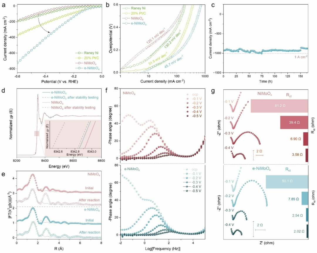 Figure 2系统呈现了e-NiMoO4在碱性析氢中的活性、稳定性及界面动力学特征:通过极化曲线与Tafel分析,对比显示e-NiMoO4的析氢活性显著优于未修饰镍钼酸盐,且Tafel斜率变化表明其碱性析氢反应机制发生转变;计时电位法稳定性测试证实e-NiMoO4在高电流密度下可长期稳定运行,结合反应后TEM观察、ICP分析及XPS表征,可知e-NiMoO4表面的外延层能减少金属溶出、维持结构完整性,而未修饰镍钼酸盐则出现明显结构变化与活性衰减;Bode相位图与Nyquist图进一步揭示界面动力学差异,未修饰镍钼酸盐在析氢前会发生电化学诱导的结构演化,而e-NiMoO4展现出更稳定的频率响应与更低的电荷转移电阻,证实外延层可优化电极-电解质界面动态过程,提升电荷转移效率。