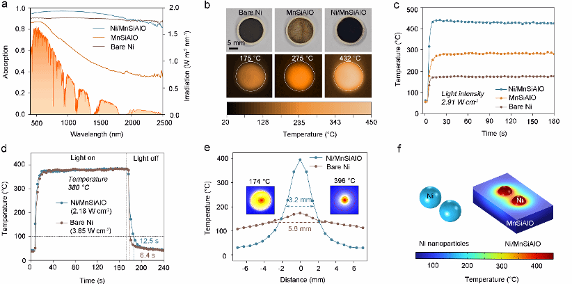 图3 a) 不同样品在紫外-可见-近红外范围内的光吸收率。b)不同样品在2.91 W·cm⁻²辐照下的热成像结果。表面温度随时间的变化:c) 在2.91 W·cm⁻²辐照下, d) 在相同温度下(380 °C)。e) 在激光照射下,纯镍和Ni/MnSiAlO中心辐照区域的热分布。f) 在2.91 W·cm⁻²光照下,纯镍和Ni/MnSiAlO温度分布的模拟结果。