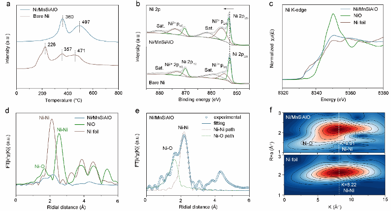 图2 a) 纯镍和Ni/MnSiAlO的H₂-TPR曲线。b) 纯镍和Ni/MnSiAlO的Ni 2p准原位XPS表征。c) Ni/MnSiAlO、金属Ni箔和NiO参考样品的Ni K边XANES比较。d) Ni箔、NiO和Ni/MnSiAlO的EXAFS分析(k³加权,傅里叶变换)。e) Ni K边EXAFS分析:Ni/MnSiAlO的实验数据与拟合结果;虚线表示Ni/MnSiAlO中Ni-Ni和Ni-O的散射路径。f) Ni箔和Ni/MnSiAlO的k³加权EXAFS小波变换分析。