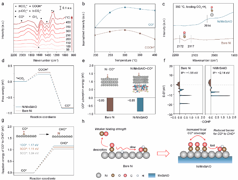 图5 a) Ni/MnSiAlO催化剂的DRIFTS分析。 b) Ni/MnSiAlO上COOH*和CO*归一化峰面积的变化。c) Ni/MnSiAlO与纯镍的原位DRIFTS光谱对比。d) 镍和Ni/MnSiAlO表面CO₂转化为CO的吉布斯自由能变化计算曲线。e)纯镍与Ni/MnSiAlO催化剂上CO*吸附能的比较。f) CO*在纯镍和Ni/MnSiAlO上吸附的晶体轨道哈密顿布居(-COHP)曲线。g) Ni/MnSiAlO上CO*加氢生成CHO*的反应能随CO*覆盖度的变化关系。h) MnSiAlO载体促进镍纳米颗粒对CO*中间体吸附,从而增强CO₂甲烷化反应。