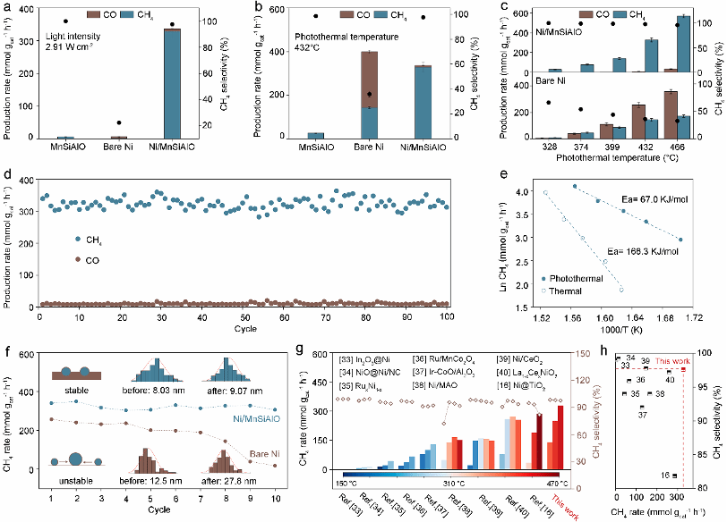 图4 a) 不同样品在相同光强(2.91 W·cm⁻²)下的产物生成速率。b) M不同样品在相同光热温度(432 °C)下的产物生成速率。c) Ni/MnSiAlO和纯镍催化剂在不同温度下测得的光热CO₂加氢效率。d) Ni/MnSiAlO的循环稳定性测试(运行条件:CO₂与H₂比例为1:4,反应器初始压力为0.1 MPa,光照强度设定为2.91 W·cm⁻²,每个循环持续15分钟)。e) Ni/MnSiAlO催化剂在光热催化与热催化反应中的Arrhenius图比较。f) Ni/MnSiAlO和纯镍在相同温度(432 °C)下的循环稳定性;插图说明了反应前后稳定性机制及颗粒尺寸分布。g) Ni/MnSiAlO与文献报道催化剂在不同温度下的催化性能与选择性对比。h)展现出CH₄活性与选择性最佳平衡的催化剂。