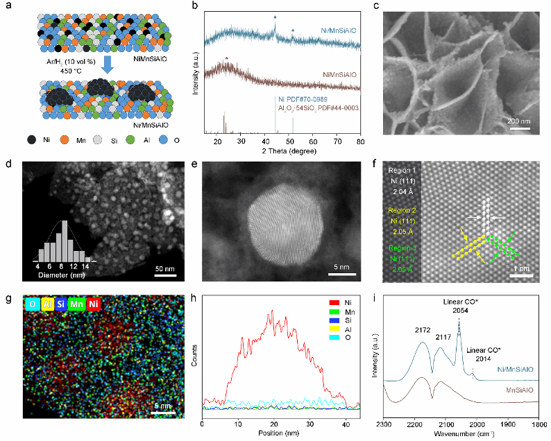 图1 a) 镍纳米颗粒原位溶出的示意图。b) NiMnSiAlO和Ni/MnSiAlO的XRD图谱。c) Ni/MnSiAlO的SEM图像。d−f) 像差校正的HAADF-STEM成像。g, h) Ni/MnSiAlO的EDS元素映射。i) MnSiAlO和Ni/MnSiAlO的CO-DRIFTS光谱。