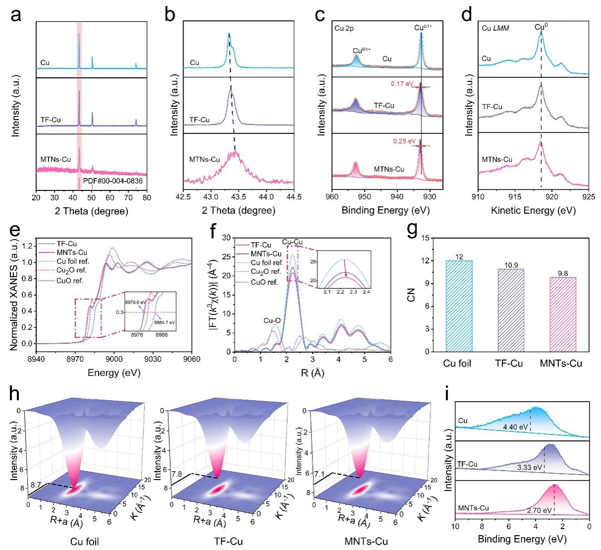 图3 电子结构分析。a, b) Cu、TF-Cu和MNTs-Cu的XRD图谱。c) Cu 2p XPS谱。d) Cu LMM俄歇谱。e) 归一化Cu K边XANES谱。f) 未经相位校正的Cu K边FT-EXAFS谱。g) 从FT-EXAFS谱获得的配位数(CNs)。h) k3加权EXAFS谱的Morlet小波变换等高线分析。i) 价带XPS谱。