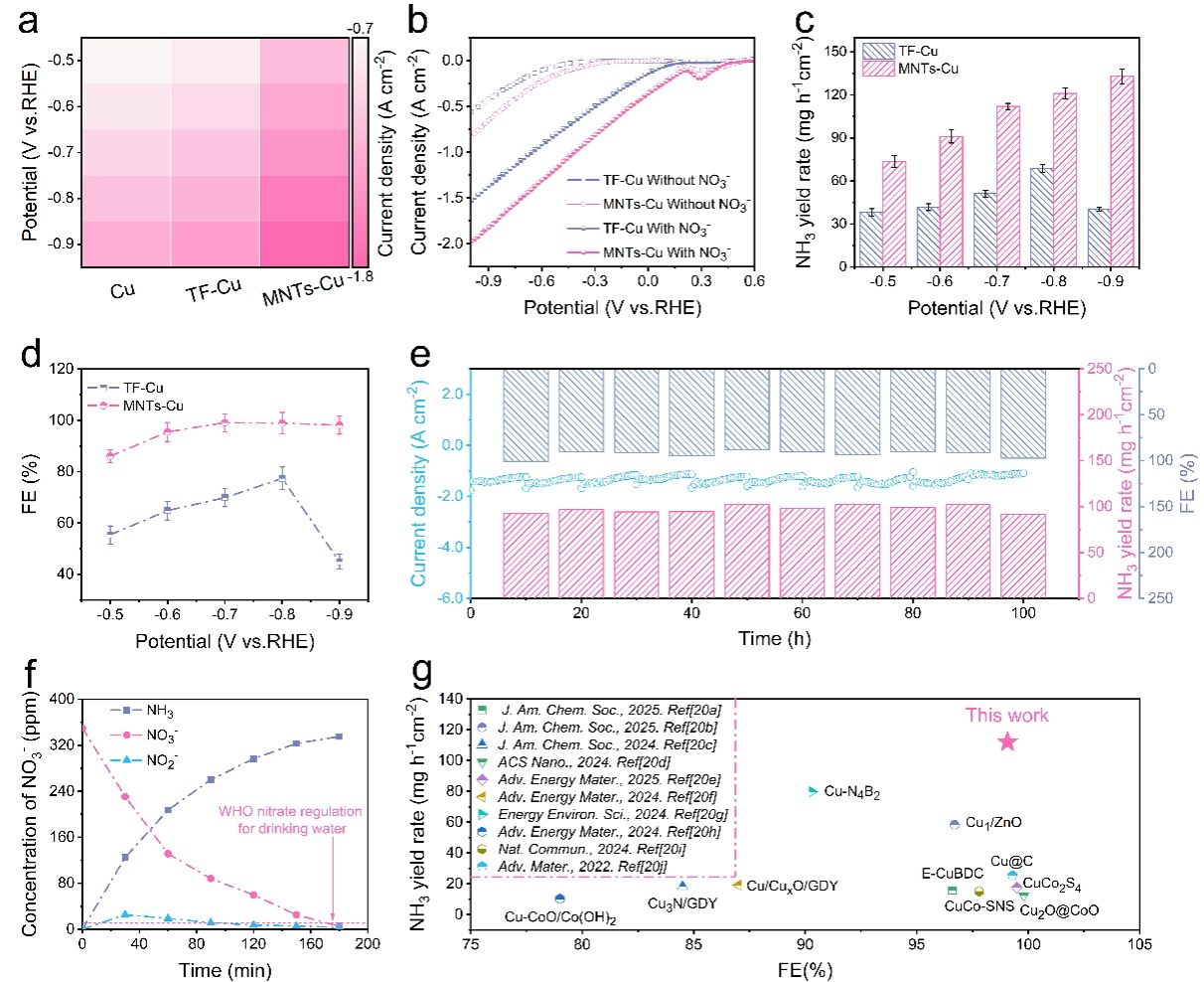 图4 电催化性能。a) 由LSV曲线得出的热图。b) MNTs-Cu和TF-Cu的LSV曲线。c) 在1 M KOH + 0.1 M NO3⁻溶液中,MNTs-Cu和TF-Cu在各给定电位下的NH3产率和d) FE。e) MNTs-Cu催化剂的计时电流稳定性测试(电解液每10小时更换一次)。f) MNTs-Cu在−0.7 V vs. RHE下随时间变化的NO3⁻-N、NO2⁻-N和NH3-N浓度。g) 在相同条件下,MNTs-Cu与已报道Cu基电催化剂的NIRR性能比较。误差棒表示其平均值的相对标准偏差(n = 3)。