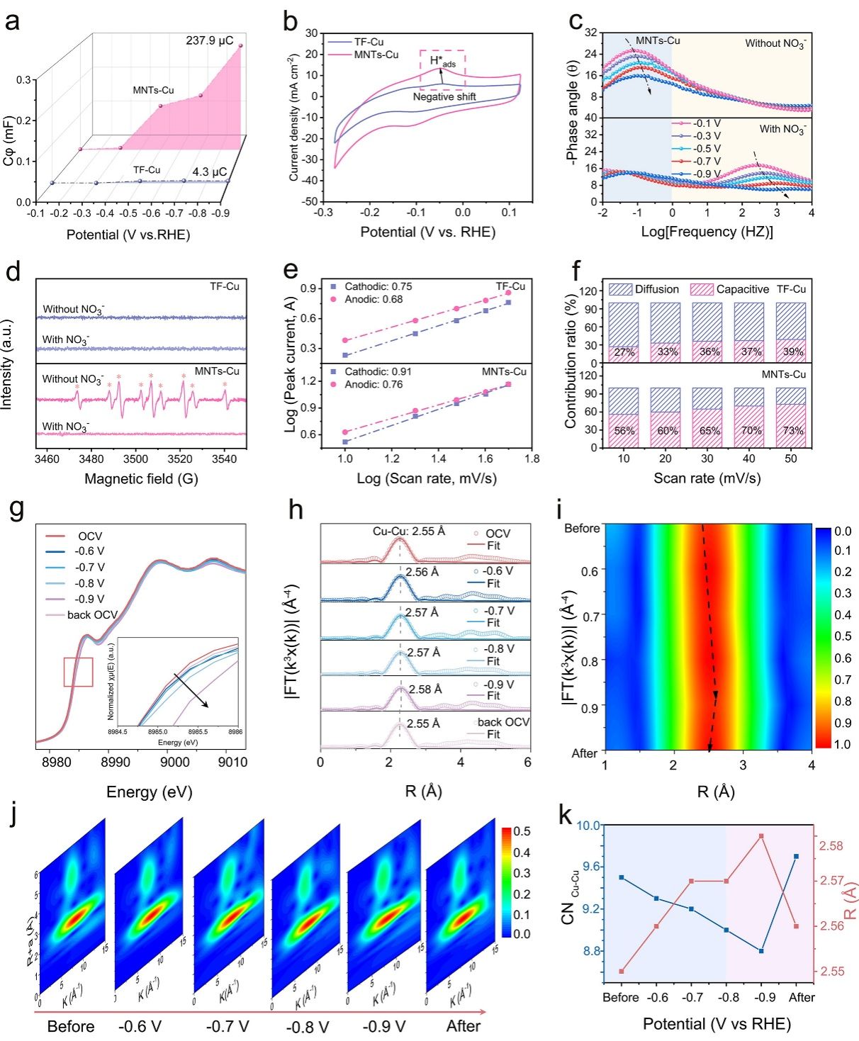 图5 催化机理分析。a) MNTs-Cu和TF-Cu的QH图。b) MNTs-Cu和TF-Cu在1 M KOH中的CV曲线。c) MNTs-Cu在不同电位下,在含或不含NO3⁻的1.0 M KOH电解液中的Bode相位图。d) 在不同电解条件下,MNTs-Cu和TF-Cu的DMPO参与ESR谱。e) MNTs-Cu和TF-Cu的b值。f) 赝电容和扩散电容的贡献。g) MNTs-Cu的原位XANES谱。h) MNTs-Cu的Cu K边k3加权FT-EXAFS谱的拟合曲线及i) 相应的映射图像。j) MNTs-Cu的Cu原位WT-EXAFS。k) NIRR过程中Cu–Cu配位数与键长的关系