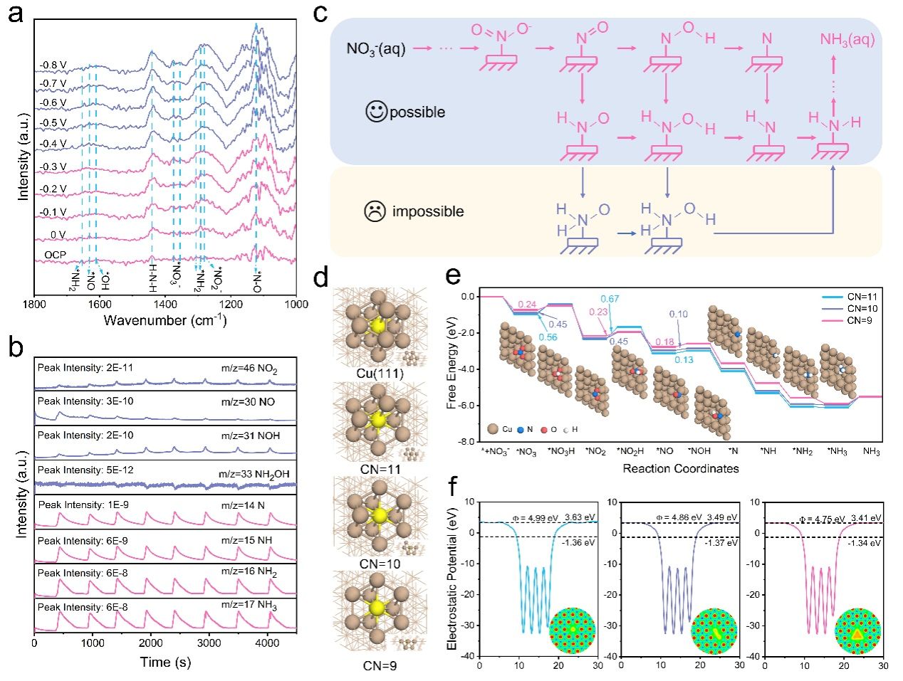 图6 MNTs-Cu对NIRR的机理探索。a) NIRR过程中MNTs-Cu的原位FTIR谱。b) NIRR过程中MNTs-Cu的电化学在线DEMS测试。c) MNTs-Cu上提出的NIRR反应路径机理。d) 具有不同CNs的Cu模型。e) 在不同CNs的MNTs-Cu上NIRR的反应自由能。f) 具有不同CNs的MNTs-Cu的功函数。
