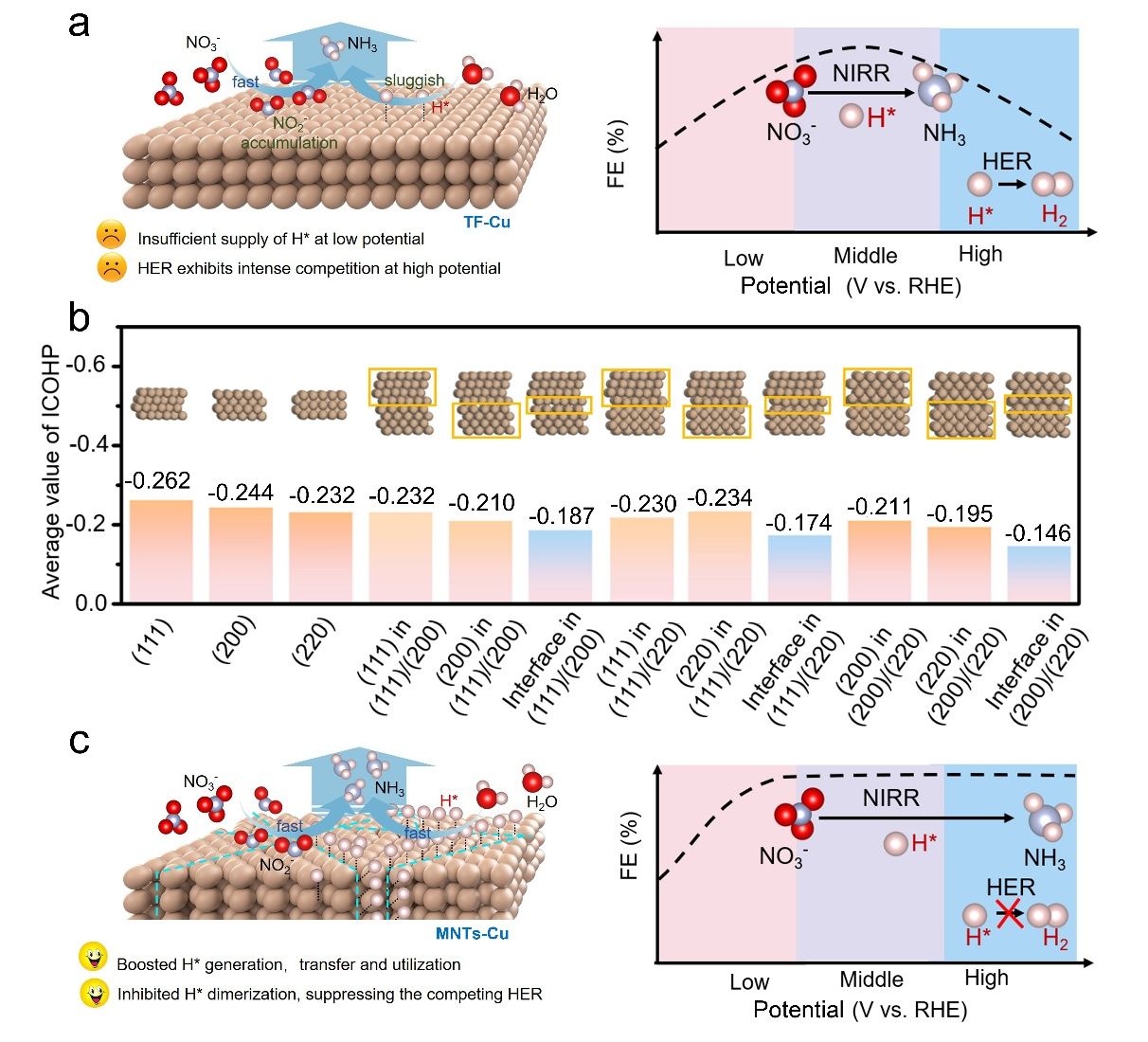 图1.MNTs-Cu合成的设计指导原则。a) NIRR示意图及TF-Cu相应的FENH3推测图。b) 不同结构Cu材料上的ICOHP值。c) NIRR示意图及MNTs-Cu相应的FENH3推测图。