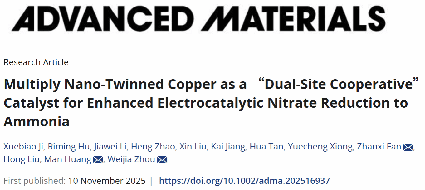 Multiply Nano‐Twinned Copper as a Dual‐Site Cooperative Catalyst for Enhanced Electrocatalytic Nitrate Reduction to Ammonia. Advanced Materials, 2025.