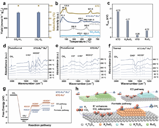 机理研究表明,一方面,K2RuO3和KTO载体中的K离子作为碱性助剂,显著增强了CO2的吸附能力。另一方面,原位红外光谱和理论计算表明,稳定的Ruδ+位点倾向于引导反应走甲酸盐路径,该路径能显著降低CO2加氢的能垒。而金属Ru0位点则更容易产生CO中间体,路径能垒较高。