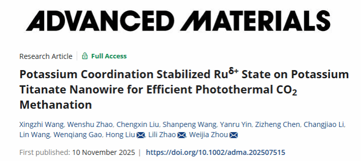 Xingzhi Wang, Wenshu Zhao, Chengxin Liu, Shanpeng Wang, Yanru Yin, Zizheng Chen,Changjiao Li, Lin Wang, Wenqiang Gao, Hong Liu,* Lili Zhao,* Weijia Zhou*. Potassium Coordination Stabilized Ruδ+ State on Potassium Titanate Nanowire for Efficient Photothermal CO2 Methanation.” Adv. Mater. (2025): e07515.