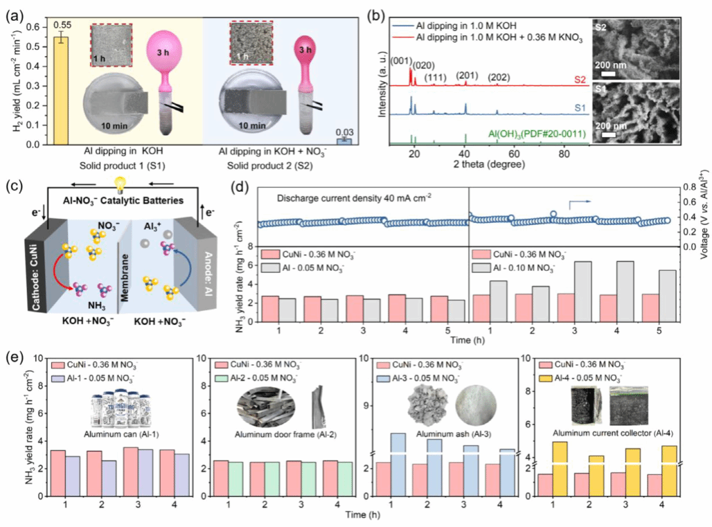 图5. 通过在阳极添加NO₃⁻、由Al&NO₃⁻自发反应驱动的Al-NO₃⁻催化电池的化学及电化学性能。a) 金属Al浸入KOH溶液及含NO₃⁻的KOH溶液中的H₂产量及宏观表面变化。b) Al浸入KOH(S1)和KOH+NO₃⁻(S2)溶液后所得固体产物的XRD图谱,以及固体产物Al(OH)₃的SEM图像。c) 水系Al-NO₃⁻催化电池示意图。d) NH₃产量与放电曲线。e) 使用不同生活及工业铝废料作为负极,并在Al阳极控制NO₃⁻浓度为0.05 M时的NH₃产量。