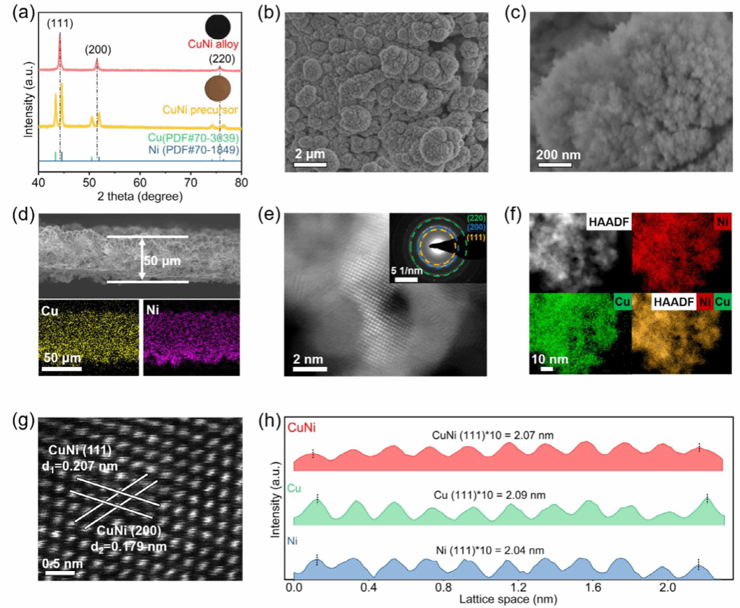 图1. Cu、Ni和CuNi合金薄膜的形貌与晶格表征。a) CuNi合金薄膜及其前驱体的XRD图谱与实物图像。b, c) CuNi合金薄膜表面的SEM图像,及d)截面形貌与元素分布图。e) CuNi合金内部的像差校正HAADF-STEM图像及SAED衍射图。f) CuNi合金的HAADF-STEM图像及EDS元素分布图。g) CuNi合金的像差校正HAADF-STEM图像。h) Cu、Ni及CuNi合金薄膜的积分像素强度分布。