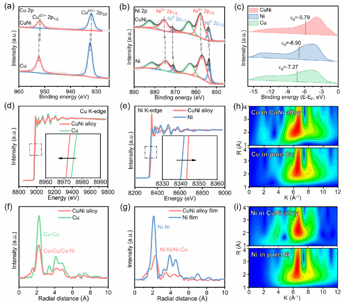 图2. Cu、Ni及CuNi合金薄膜的电子结构表征。a) Cu 2p和b) Ni 2p XPS谱图。c) 由VB-XPS数据外推得到的d带中心。d) CuNi合金薄膜与纯Cu薄膜在Cu K-edge处的归一化XANES谱。e) CuNi合金薄膜与纯Ni薄膜在Ni K-edge处的归一化XANES谱。f) Cu K-edge和g) Ni K-edge的EXAFS数据导出的FT-EXAFS谱。h) 纯Ni薄膜与CuNi合金薄膜的Ni K-edge EXAFS信号小波变换谱;i) 纯Cu薄膜与CuNi合金薄膜的Cu K-edge EXAFS信号小波变换谱。