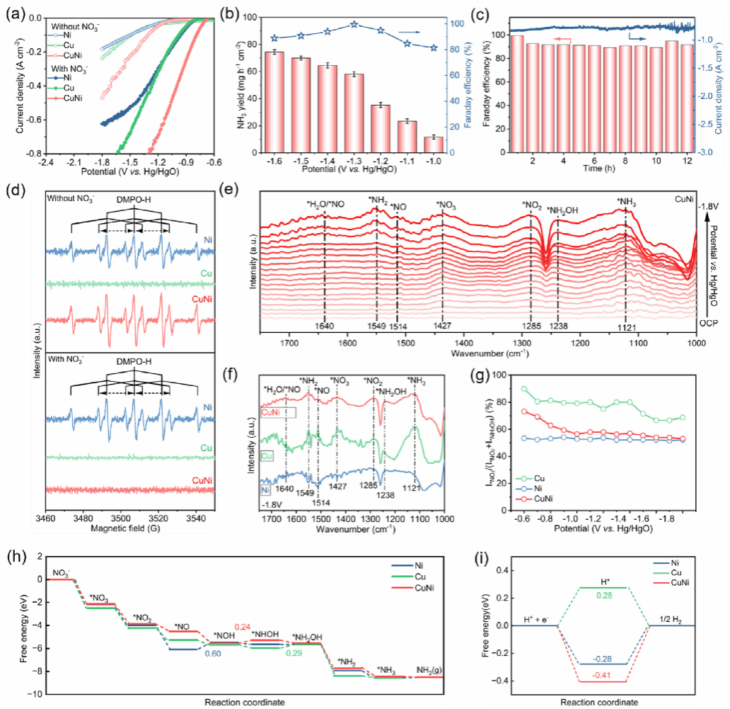图3. NH₃生产的电催化性能及反应机理研究。a) Cu、Ni和CuNi合金薄膜在含0.36 M NO₃⁻的1.0 M KOH溶液中用于NIRR的LSV曲线。b) CuNi合金薄膜在不同工作电位下的NH₃产率及法拉第效率。c) CuNi合金薄膜在-1.3 V vs. Hg/HgO条件下随时间变化的电流-时间曲线及法拉第效率。d) Cu、Ni和CuNi合金薄膜在不同电解条件下含DMPO的EPR谱图。e) CuNi合金薄膜在不同电位下进行NIRR的原位ATR-FTIR谱。f) Cu、Ni和CuNi合金薄膜在-1.8 V vs. Hg/HgO下的原位ATR-FTIR谱。g) 不同电极电位下I∗NO₂/(I∗NO₂+I∗NH₂OH)比值。h) NIRR和i) HER在Cu(111)、Ni(111)和CuNi(111)表面的自由能变化。