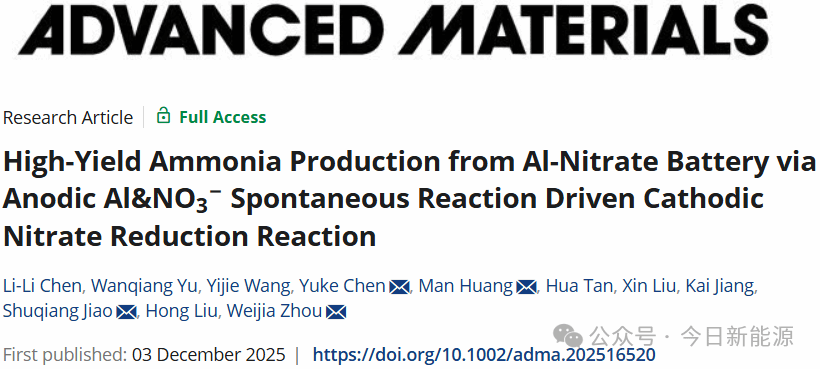 2025年12月3日,济南大学周伟家、黄曼、陈玉客、陈丽丽团队在Advanced Materials期刊发表题为“High-Yield Ammonia Production from Al-Nitrate Battery via Anodic Al&NO3− Spontaneous Reaction Driven Cathodic Nitrate Reduction Reaction”的研究论文,陈丽丽为论文第一作者,周伟家、北京科技大学焦树强、黄曼、陈玉客为论文共同通讯作者。
