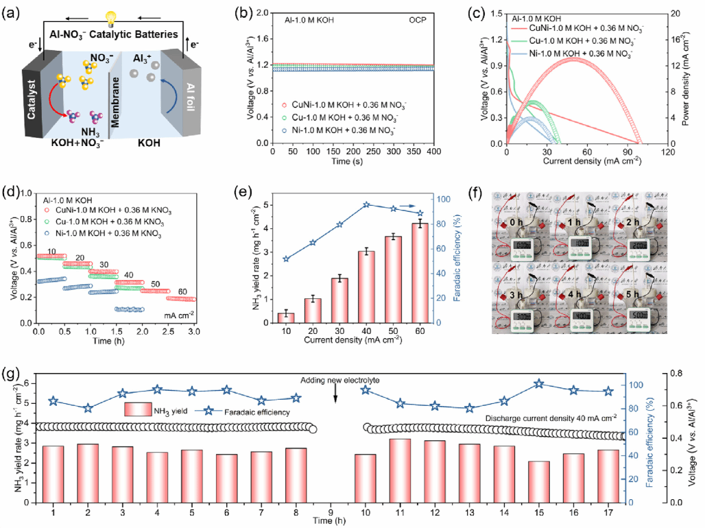 图4. 未在阳极添加NO₃⁻、由Al&OH⁻自发反应驱动的Al-NO₃⁻催化电池的电化学性能。a) 水系Al-NO₃⁻催化电池示意图。b) 水系Al-NO₃⁻催化电池的开路电位。c) Cu、Ni和CuNi合金在含0.36 M NO₃⁻的1 M KOH中的放电极化曲线及对应功率密度。d) Cu、Ni和CuNi合金在不同电流密度下的倍率性能。e) CuNi合金薄膜在不同电流密度下的NH₃产率及法拉第效率。f) Al-NO₃⁻催化电池为电子计时器供电工作5小时的照片。g) CuNi合金在40 mA cm⁻⟡电流密度下放电时的NH₃产率及法拉第效率。