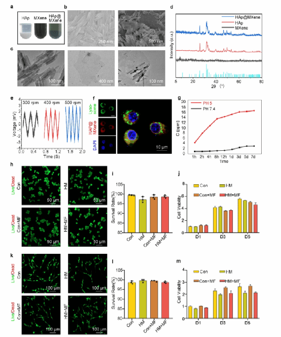 研究团队成功合成了HAp@MXene纳米复合材料,其具有良好的细胞相容性,且能够在磁场作用下产生感应电压,证实了其磁电效应。此外,验证了材料在酸性环境下(溶酶体)的钙离子释放能力,为后续的细胞实验提供了理论基础。