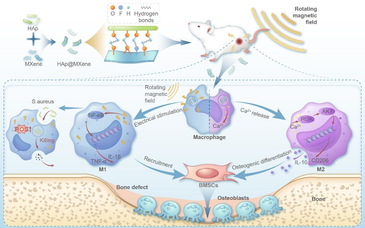 图 1 . HAp@MXene调控巨噬细胞极化促进骨修复机制图