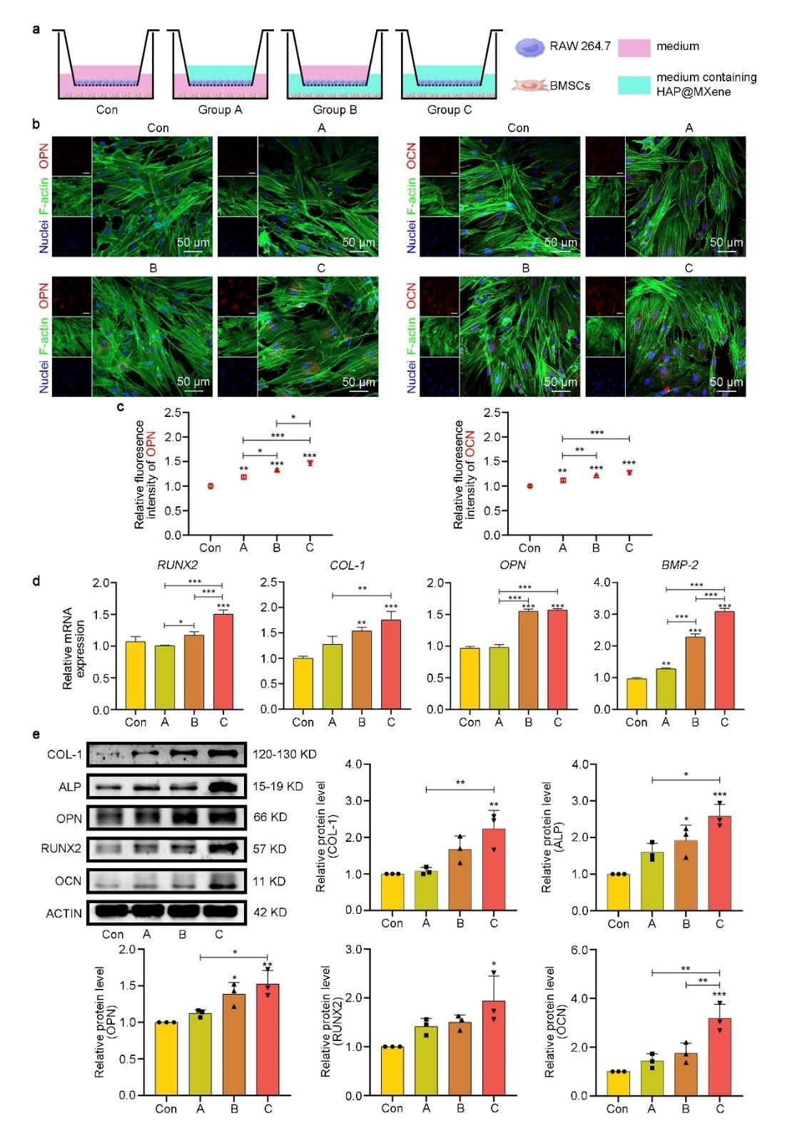 为验证M2巨噬细胞协同材料促进成骨的作用,在transwell系统中对RAW 264.7和MSCs进行共培养,实验分为四组:Control组(不添加材料);A组(上室内添加材料);B组(下室内添加材料);C组(上室和下室均添加材料)。A组和C组的上室添加材料后,巨噬细胞朝M2方向极化,与Control组和B组的M0巨噬细胞形成对比,实验结果表明,M2极化的巨噬细胞分泌的因子显著促进了MSCs的成骨分化,表现为OPN、OCN等成骨标志物的高表达,进一步证实了HAp@MXene在骨修复中的协同作用。