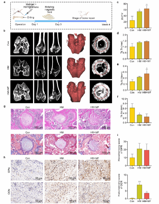 接下来评估了HAp@MXene对MSCs成骨分化的影响。结果显示,HAp@MXene显著提高了成骨相关蛋白(OPN、OCN)的表达,以及Runx2、Col-1、OPN和BMP-2等成骨相关基因的表达,表明HAp@MXene对间充质干细胞的成骨分化具有极佳的促进作用,加速骨组织再生,而转磁处理对间充质干细胞的成骨分化无显著影响。
