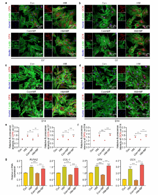 图3揭示了HAp@MXene对巨噬细胞极化的动态调控:在磁场作用下,巨噬细胞表现出M1极化特征(高表达TNF-α、IL-1β和iNOS),去除磁场后,巨噬细胞转向M2极化(高表达IL-10、CD206和Arg-1)。这一结果在mRNA和蛋白水平均得到验证,表明HAp@MXene可通过磁场精准调控巨噬细胞极化,证明了利用纳米材料配合磁场影响巨噬细胞表型,前期M1促进炎症反应,后期M2抗炎并促进骨细胞增殖分化,时序调控巨噬细胞极化参与组织再生的可行性,这为骨修复中的免疫微环境调控提供了有力工具。