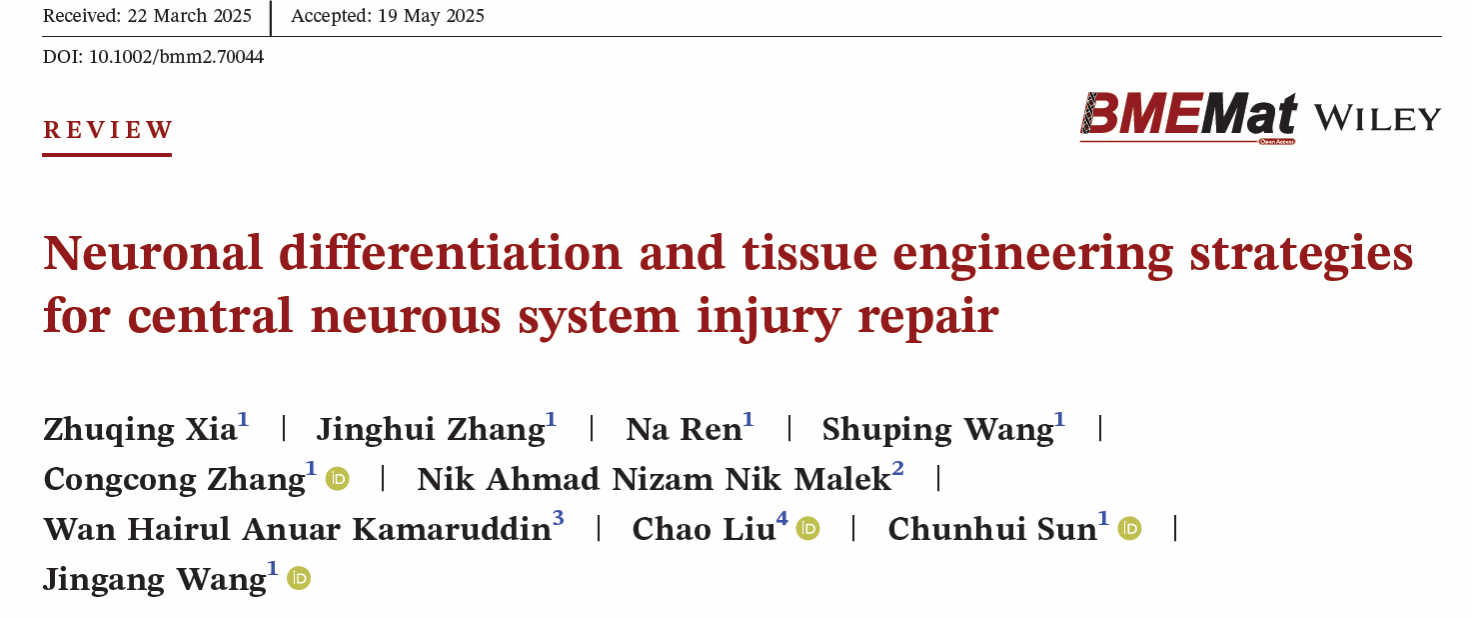 【背景】中枢神经系统(CNS)损伤,比如严重脑外伤、脊髓损伤,常常会导致瘫痪、失语、认知障碍等,不仅给病患带来了病痛折磨和沉重的心理打击,也让家庭背负了长期陪护和经济压力。然而传统的手术与康复手段治疗效果有限,难以实现神经功能的根本性重建。随着再生医学的快速发展,神经组织工程成为最具前景的治疗方向。中枢神经系统的修复不再局限于简单的康复或手术治疗,而是致力于在损伤处营造一个功能性的神经微环境,引导神经再生。济南大学王金刚团队与山东大学齐鲁医院刘超团队合作,基于神经元分化和组织工程在中枢神经系统中的应用,在BMEMat上发表了题为“Neuronal differentiation and tissue engineering strategies for central neurous system injury repair”的综述性文章。该综述从组织工程的三要素出发,总结了神经组织工程在中枢神经系统损伤中的应用。