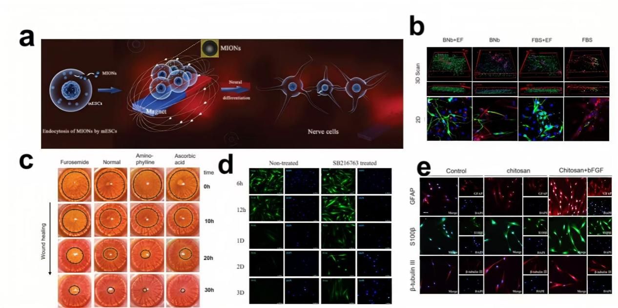 本综述以功能化生物支架材料为“基地”,结合合适的“种子”细胞,并利用材料自身的理化特性(如导电、压电)或相关的诱导因子,在中枢神经损伤部位创造一个功能性、可促进再生的微环境。