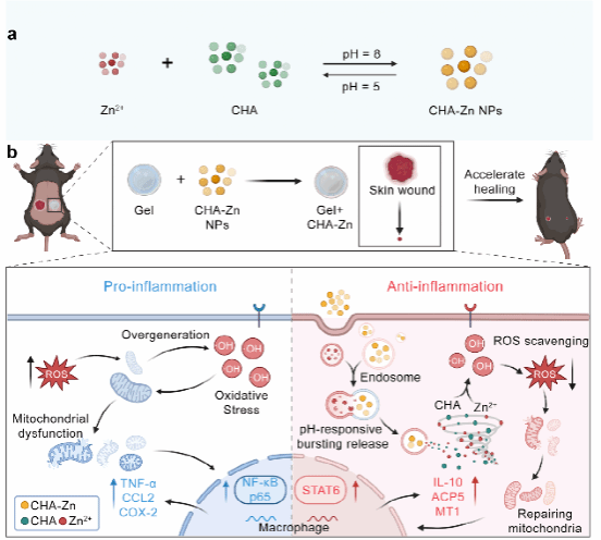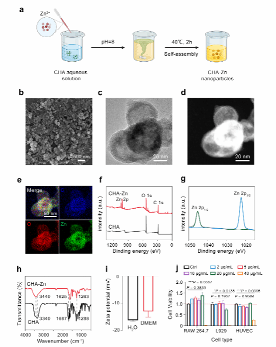 研究团队采用了一步制备策略通过将绿原酸(天然植物提取物)与锌离子(Zn2+)相结合,合成了绿原酸-锌纳米颗粒(CHA-Zn NPs),开发一种具有“活性氧清除—线粒体修复—巨噬细胞极化调控”协同机制的创新型纳米药物。