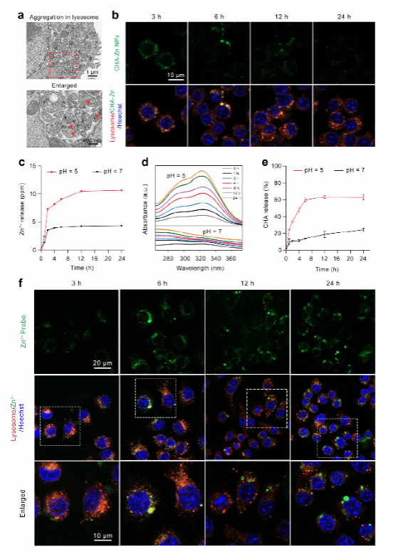 研究团队进一步研究了CHA-Zn NPs在巨噬细胞内的重编程机制,高分辨率透射电子显微镜(HR-TEM)显示,除了少量颗粒附着在细胞膜表面外,大量CHA-Zn NPs在溶酶体中密集聚集。进一步使用荧光素异硫氰酸酯(FITC)标记的纳米颗粒(绿色)与巨噬细胞进行共培养,进行溶酶体染色。在孵育3小时后,纳米颗粒在细胞内的分布达到最大值,荧光强度也达到最大值。随着孵育时间的延长,荧光信号减弱,这表明内化的纳米颗粒首先在溶酶体中积累,随后在细胞内发生逐步的解离。电感耦合等离子体质谱法(ICP-MS)在细胞外模拟了CHA-Zn NPs中锌离子的释放行为,在pH≈5,CHA-Zn在6小时内迅速分解,引发锌离子的爆发性释放—“锌离子风暴”。