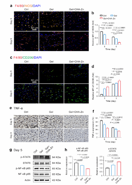 进一步评估巨噬细胞在创面组织中的浸润,在不同时间点进行免疫荧光染色。与Ctrl组和Gel组相比,Gel+CHA-Zn NPs组M1型巨噬细胞浸润(F4/80和iNOS)明显减少,M2型巨噬细胞浸润(F4/80和CD206)明显增加。免疫组化结果显示,与Ctrl组相比,Gel+CHA-Zn NPs组在第5天TNF-α的表达明显减少,到第9天几乎恢复到正常水平。Western blot显示,Gel+CHA-Zn NPs组磷酸化NF-κB p65(p-NF-κB p65)表达下调,磷酸化STAT6(p-STAT6)表达上调。上述实验结果证实了CHA-Zn NPs在体内表现出良好的生物相容性和强大的抗炎作用。通过调节NF-κB p65和STAT6信号通路和重编程巨噬细胞表型,CHA-Zn NPs有效恢复了糖尿病创面微环境中的免疫稳态,显著加速了创面愈合。