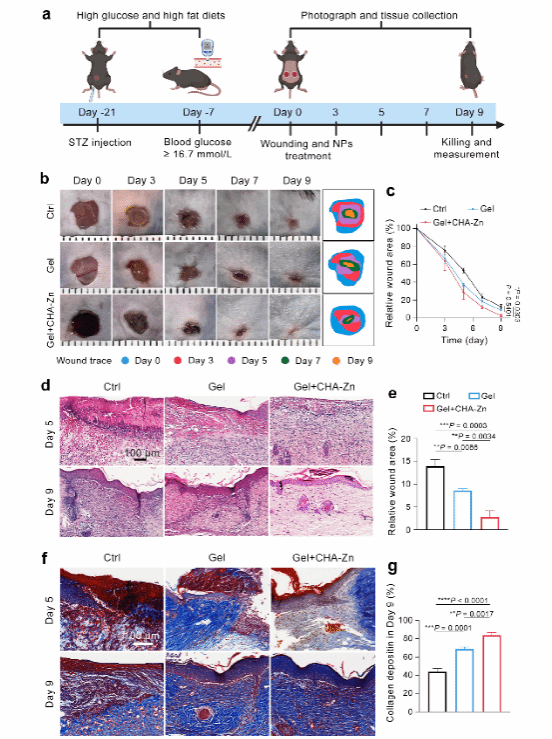 随后深入研究CHA-Zn NPs促进糖尿病小鼠伤口愈合的体内疗效。通过高糖高脂饮食联合链脲佐菌素(STZ)注射建立糖尿病小鼠模型。将创面小鼠随机分为3组:对照组(Ctrl)、GelMA水凝胶组(Gel)、水凝胶+CHA-Zn NPs组(Gel+CHA-Zn NPs)。在第0、3、5、7和9日进行肉眼观察。结果表明,到第9天,Ctrl组和Gel组的创面尚未完全愈合。其中,Gel+CHA-Zn NPs处理组的创面愈合率显著高于其他两组,创面愈合速度加快约10%。