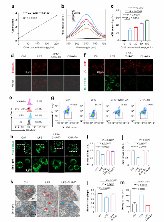 Mito绿色探针显示LPS组线粒体肿胀,结构模糊,呈囊泡形态。与此相反,CHA-Zn NPs显著减轻了LPS诱导的线粒体形态和网络连接损伤,线粒体呈现出清晰的丝状分支。LPS+CHA-Zn组的平均分支数量和分支分支连接数量均显著增加。TEM图像显示LPS诱导的M1巨噬细胞线粒体出现了严重的结构损伤,表现为基质肿胀、嵴断裂、内部空泡化和内质网(ER)变性。与对照组(Ctrl)相比,细胞线粒体平均长度减少,受损线粒体比例增加。而CHA-Zn NPs显著保留了线粒体的完整性,减少了受损线粒体的数量,并维持了正常的ER形态。说明CHA-Zn NPs通过清除过量的ROS有效地保护线粒体和ER结构免受ROS诱导的损伤。上述结果进一步表明,CHA-Zn NPs引发的细胞内离子/小分子风暴具有较强的ROS清除能力,缓解线粒体功能障碍和恢复线粒体稳态。