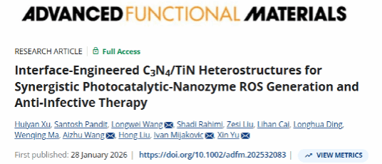 研究成果以“Interface-Engineered C3N4/TiN Heterostructures for Synergistic Photocatalytic-Nanozyme ROS Generation and Anti-Infective Therapy”发表在了国际权威期刊Advanced Functional Materials上,通讯作者是济南大学于欣教授、王爱珠副教授与瑞典查尔姆斯理工大学Ivan Mijakovic教授,滨州医学院的王龙伟教授。上述研究工作的得到了国家自然科学基金、山东省自然科学基金、山东省泰山学者基金等计划的支持。