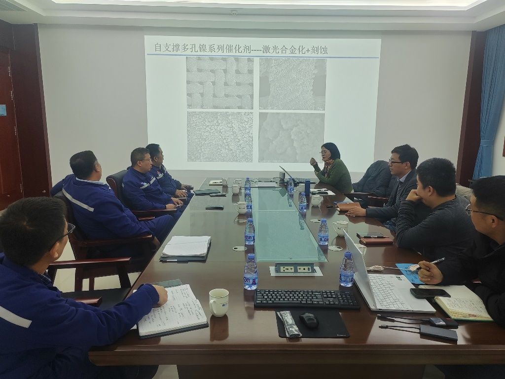 济南大学团队随后汇报了两项核心成果:《电催化与高值分子绿色合成》和《雷尼系列催化剂研究》。针对鲁西化工面临的硝酸盐废水、废盐酸处理等环保难题,团队介绍了资源化利用等技术路径与解决方案。针对雷尼钴催化剂的进口依赖问题,团队展示了利用激光制备工艺改进催化剂生产的研究成果,简化了传统熔炼法的步骤,提升了生产效率并实现了成本可控。此外,团队还提出通过添加助剂和优化结构,提升催化剂活性并降低自燃风险的技术方案。实验室自制催化剂的转化率已优于市场上商业产品。