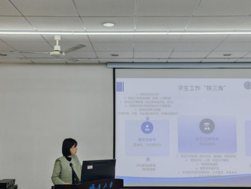 孟老师负责学生工作介绍,涵盖研究生日常管理、研究生培养与管理的具体内容,包括硕博期间开题中筛、中期、论文答辩、学位授予等各重要时间节点的工作安排,志愿者招募、各类公示以及学业奖学金评定详情等,强调不同专业的学位授予创新成果审核标准,让新生对研究生阶段的行政事务与权益保障有了清晰认知。